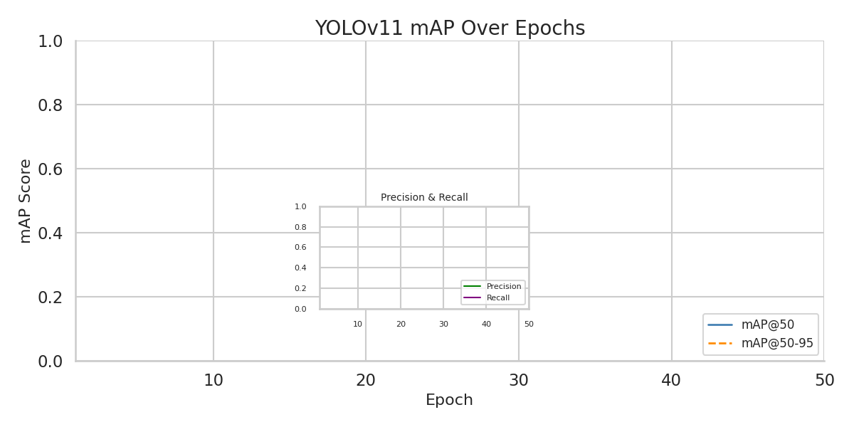 We fine-tuned a YOLOv11x model, chosen for its strong accuracy-speed balance. Training ran for 50 epochs using pre-trained weights adapted to our dataset.
